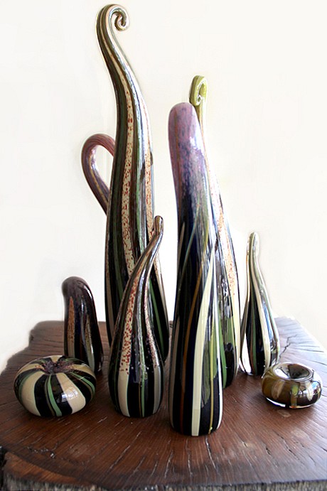 hand blown glass, reclaimed wood and welded steel base, 60" x 14" x 15"